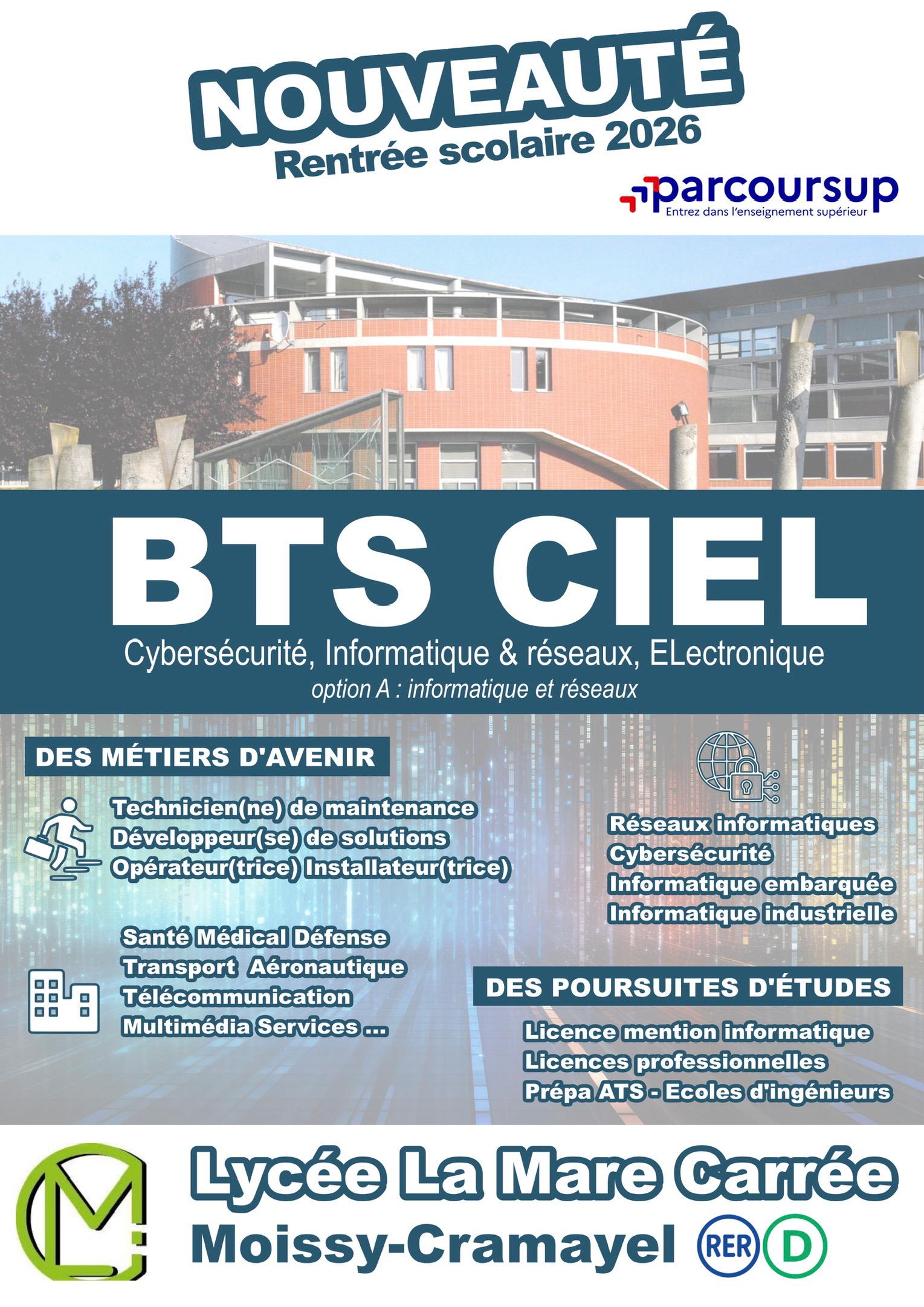 En Savoir + Vous êtes en terminale, venez découvrir le BTS CIRA et le BTS CIEL (ouverture rentrée 2026) Mardi 10 mars 2026 de 16h00 à 20h00 Au lycée de la Mare Carrée PORTES OUVERTES AU LYCÉE DE LA MARE CARRÉE SAMEDI 28 MARS 2026 DE 9H00 à 12H30